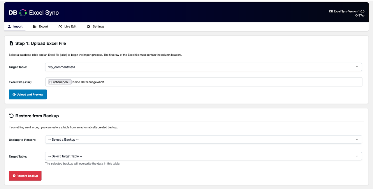 DB Sync for Microsoft Excel is a powerful admin tool for syncing WordPress database tables with Excel files. Import .xlsx files, export tables, restore backups, and edit data live — all directly from the WP dashboard.