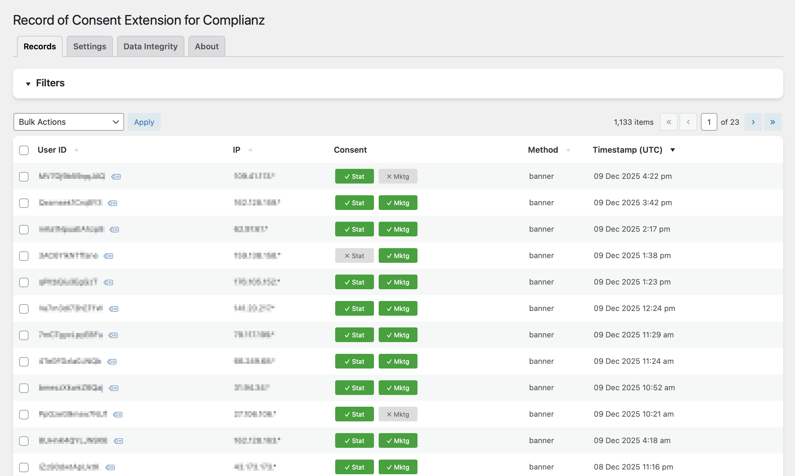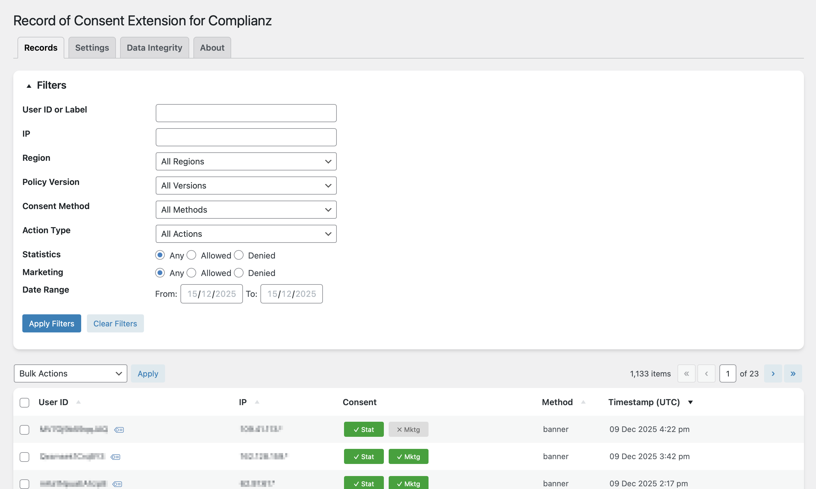 - Consent records will be stored automatically when Complianz triggers consent events.