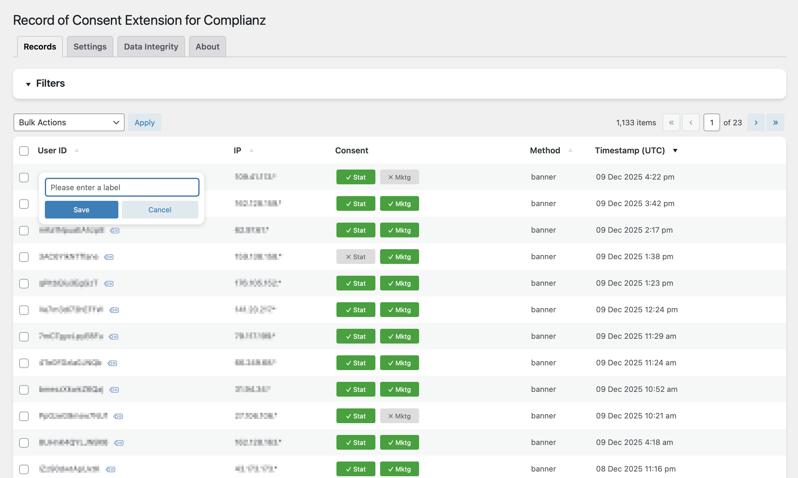 Initial release with full consent recording, tamper-resistant records, privacy-preserving user labels, advanced filters, export, and data retention features.