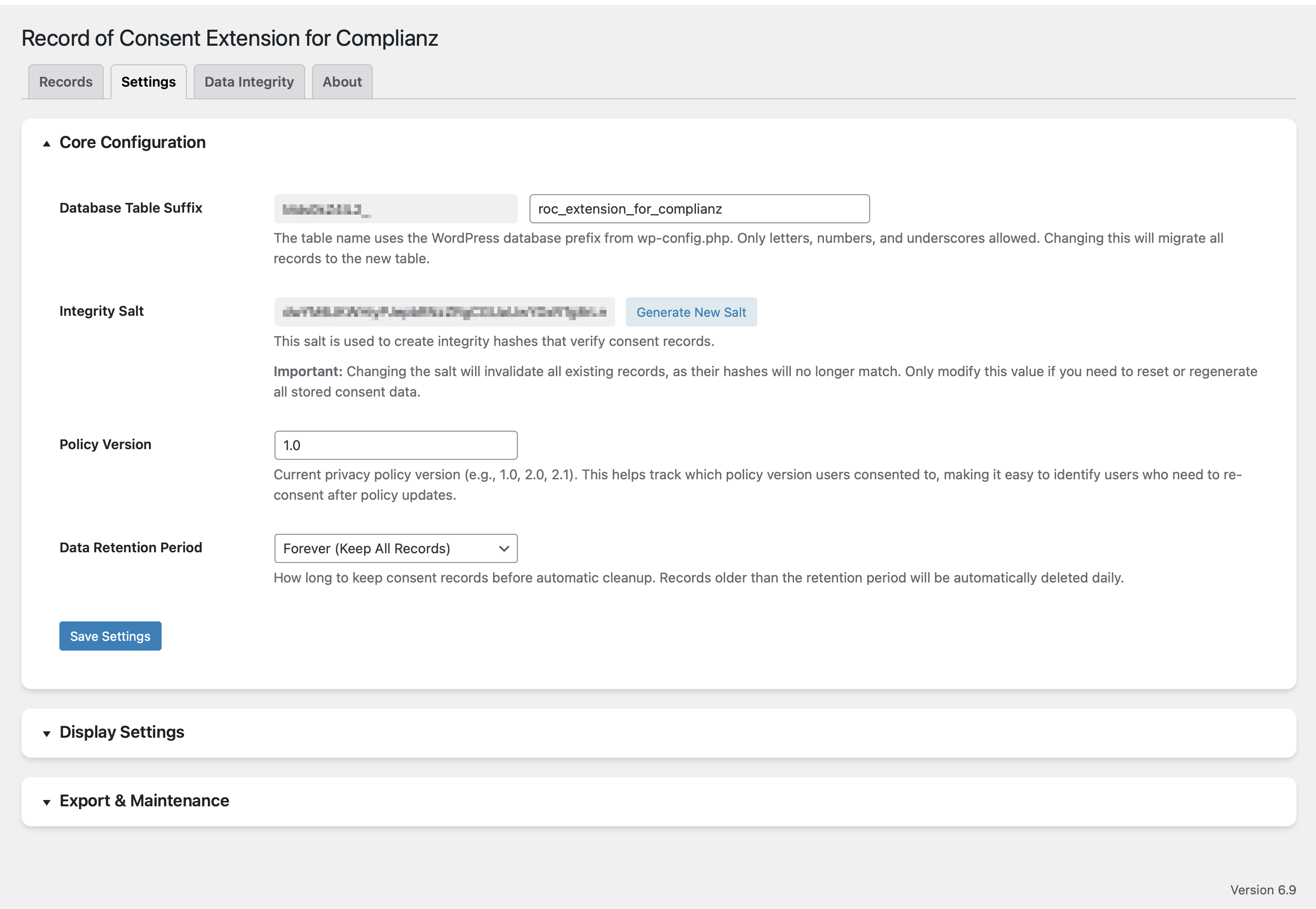 Each consent record is protected with a SHA-256 hash that uses a secret salt. If someone changes a record directly in the database, the integrity check will detect the mismatch.