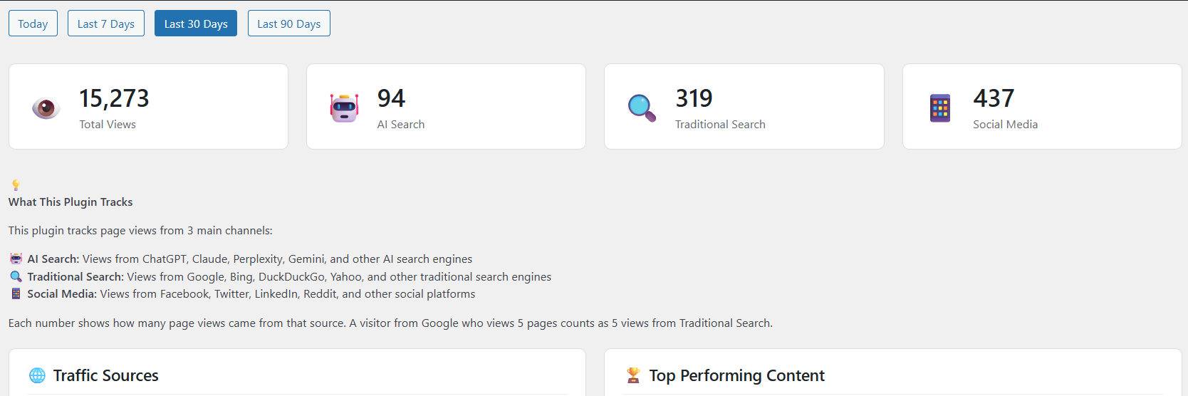We analyze the HTTP referer (where visitors came from) to identify traffic sources. When someone clicks a link in ChatGPT, Claude, Perplexity, etc., the referer tells us which AI engine sent them.